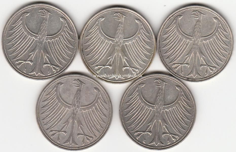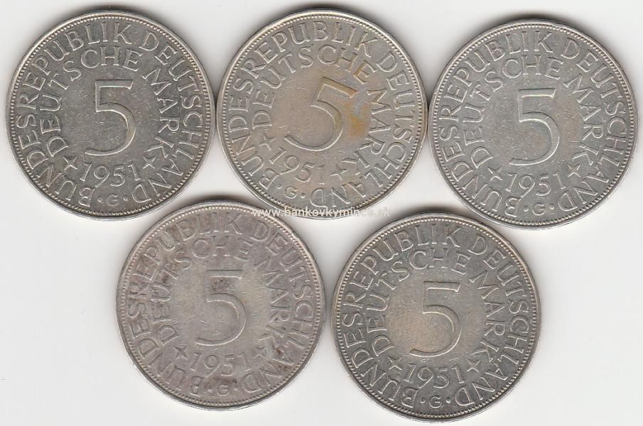 Úvod MINCOVÉ PLATIDLÁ Svetové minceKonvolut 5ks 5 marka 1951 G Nemecko